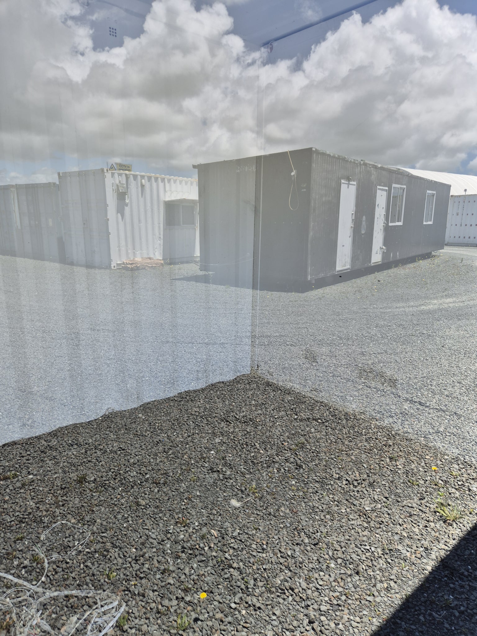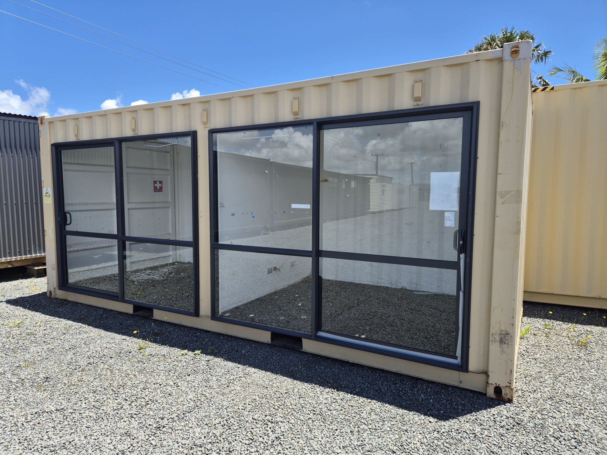 1 x 20ft Container (standard height) With 2 Ranchsliders (good condition modern, single glazed) fitted (very poorly) no box section has been welded in.